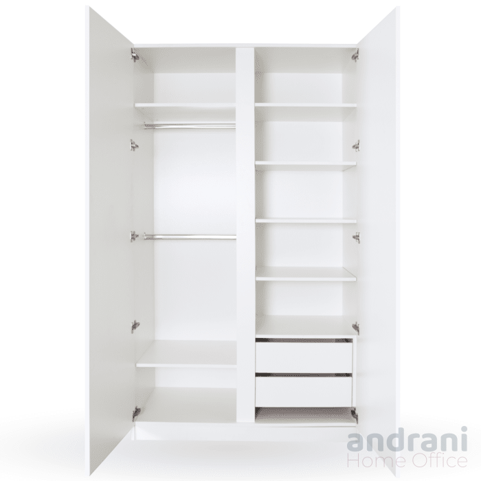 Interiorul dulapului este compartimentat eficient, fiind prevăzut cu zonă pentru umerașe (cu bară metalică), polițe pentru depozitare și sertare inferioare, oferind multiple opțiuni de organizare pentru haine, accesorii sau lenjerii.