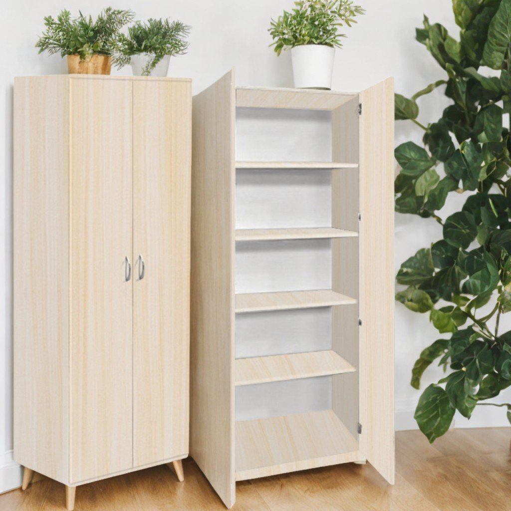 Dimensiuni (L×l×h): 802×403×1816 mm. Greutate: 57,28 kg. Dulapul este realizat din PAL melaminat cu grosime de 18 mm. Fațada este finisată cu cant ABS de 1 mm, iar piesele interioare sunt prevăzute cu cant ABS de 0,5 mm. Peretele din spate este realizat din PFL melaminat alb, cu grosime de 3 mm. Configurația include 5 rafturi închise, cu posibilitatea reglării distanței dintre ele. Dulapul este dotat cu mânere cromate și picioare din plastic reglabile. Piesele sunt asamblate cu elemente de fixare speciale și sigure. Culori disponibile: fag, stejar deschis.