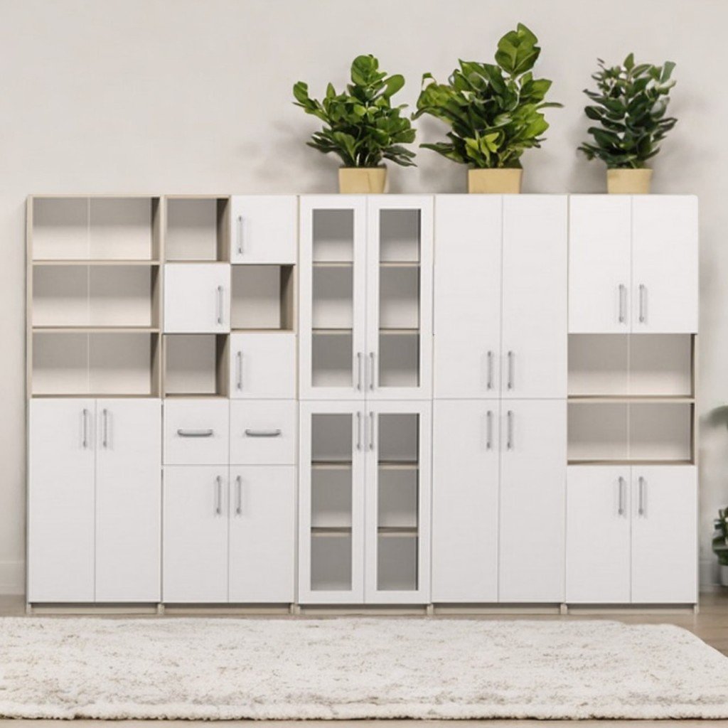 Dimensiuni (L×l×h): 3510×405×2115 mm. Set de mobilier realizat din PAL melaminat de 18 mm. Carcasa are culoarea perla artizan, finisată cu cant ABS de 0,5 mm; fațadele sunt gri deschis, finisate cu cant ABS de 1 mm. Spatele este din PFL melaminat alb de 2,5 mm. Setul este compus din 5 compartimente: (1) Dulap semi-închis cu 2 uși – 3 rafturi închise și 3 deschise, cu rafturi reglabile; (2) Dulap combinat cu 5 uși – 5 rafturi închise, 3 deschise, 2 sertare pe ghidaje telescopice cu extragere completă, cu un raft reglabil; (3) Dulap cu 4 uși din sticlă – 6 rafturi închise, cu rafturi reglabile, uși cu sticlă transparentă de 4 mm; (4) Dulap cu 4 uși – 6 rafturi închise, cu rafturi reglabile; (5) Dulap semi-închis cu 4 uși – 4 rafturi închise și 2 deschise, cu rafturi reglabile. Piesele sunt asamblate cu elemente de fixare sigure, prevăzute pentru montare pe perete. Dulapurile sunt dotate cu picioare din plastic. Culoare: perla artizan, gri deschis. Garanție: 24 luni.