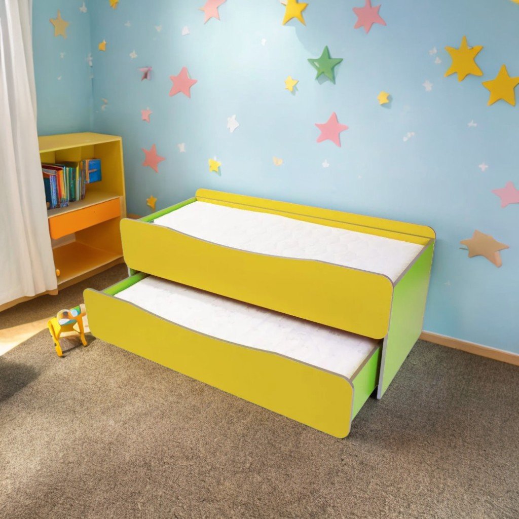 Pat pentru copii cu 2 nivele, ideal pentru economisirea spațiului. Are dimensiunile 1435 x 649 x 585 mm, cu lungimea extinsă de 1249 mm. Include un blat fix și unul mobil, montat pe roți pivotante din plastic. Suportul pentru saltea este din placaj de 7 mm, iar carcasa blatului din placaj de 12 mm. Structura este realizată din PAL melaminat de 16 mm, cu cant ABS argintiu de 1 mm. Marginile sunt rotunjite și sigure, iar partea de jos a cadrului este protejată cu garnituri din plastic rezistent. Disponibil în combinații de culori: galben/verde lămâie, galben/albastru deschis și fag. Se vinde fără saltea. Garanție: 12 luni.