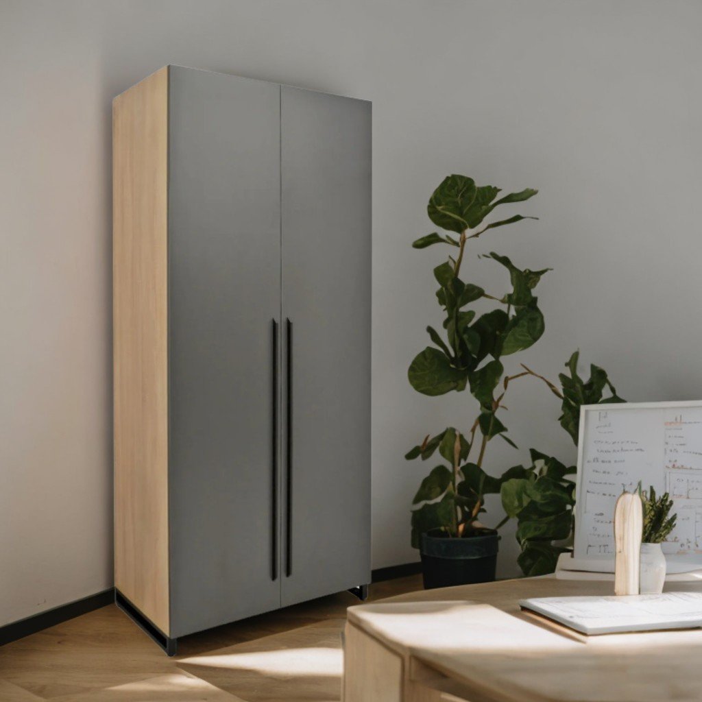 Dimensiuni (L×l×h): 900×520×2100 mm. Dulap realizat din PAL melaminat de 18 mm, cu fațadă finisată cu cant ABS de 1 mm. Spatele este din PFL melaminat alb, grosime 3 mm. Dulapul are 2 compartimente cu câte 2 uși: primul compartiment conține 5 rafturi (2 rafturi cu distanță de 30 cm între ele și 3 rafturi cu distanță de 32 cm), iar al doilea compartiment este prevăzut cu 2 rafturi și o bară ovală cromată pentru umerașe. Piesele sunt asamblate cu elemente de fixare sigure și prevăzute pentru montaj pe perete. Dulapul este echipat cu picioare metalice. Culoare: Antracit, Stejar Sonoma.