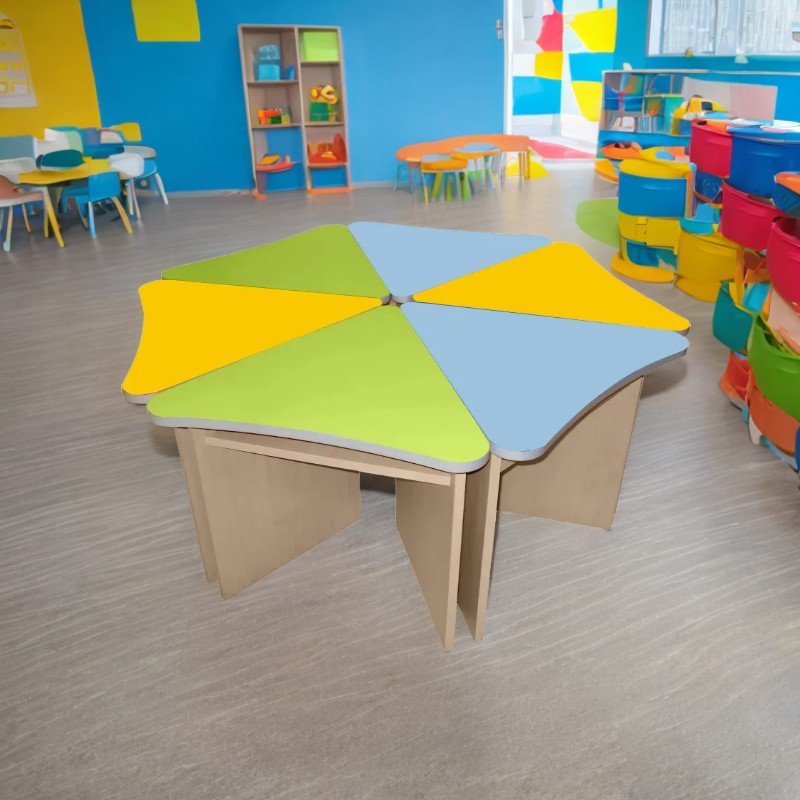 Set modular format din 5 mese de câte 700x500 mm, cu suprafață totală de 1350x1350 mm, destinat pentru 5 copii, ideal pentru activități în grup sau individuale. Blatul este din PAL melaminat colorat de 16 mm, cu colțuri rotunjite și cant ABS argintiu de 1 mm pentru siguranță. Cadrul metalic rotund, cu diametrul 25–32 mm și grosimea 1,2 mm, are reglaj telescopic pentru înălțimi de 460, 520 sau 580 mm și este protejat cu garnituri din plastic. Picioarele sunt vopsite electrostatic și prevăzute cu capace din plastic, iar îmbinările sunt sigure, cu șuruburi cu cap bombat și piulițe ascunse.