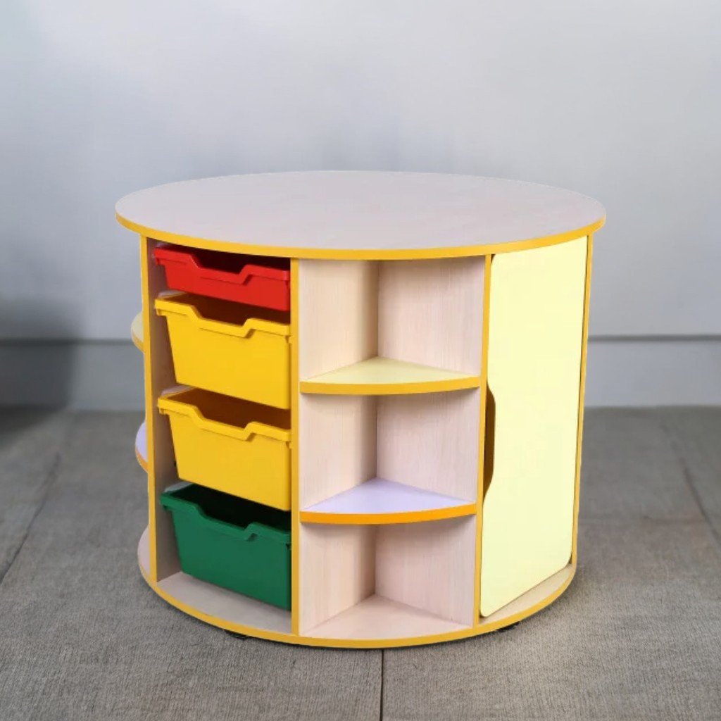 Masă multifuncțională realizată din PAL melaminat colorat de 16 mm, cu cant ABS galben de 1 mm. Rafturile și ușile sunt fabricate din PAL melaminat cu cant argintiu de 1 mm.