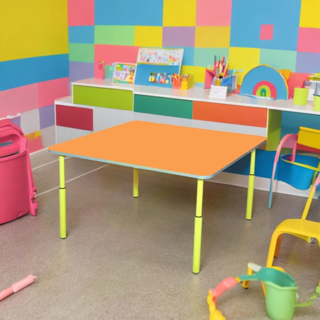 Masă pătrată, robustă și sigură, ideală pentru 4 copii. Blatul din PAL melaminat de 16 mm, cu colțuri rotunjite și cant ABS argintiu, este montat pe un cadru metalic cu profil rotund, reglabil pe înălțime (460 / 520 / 580 mm) prin sistem telescopic cu garnituri de protecție. Picioarele sunt vopsite electrostatic și prevăzute cu capace din plastic. Toate îmbinările sunt solide și sigure, cu piulițe ascunse.