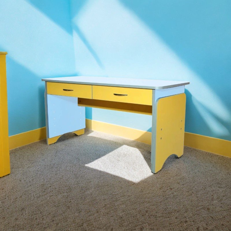 Masă practică pentru 2 copii, cu blat din PAL melaminat de 16 mm, colțuri rotunjite și cant ABS argintiu. Include câte un sertar individual cu mâner cromat pentru fiecare copil. Înălțimea se reglează în 4 trepte: 500, 560, 620 și 680 mm. Picioarele sunt prevăzute cu garnituri din plastic rezistent pentru stabilitate și protecție. Dimensiuni: 1100 x 500 mm | Greutate: 28,1 kg | Garanție: 24 luni Culori disponibile: galben/lămâie verde, galben/albastru, fag