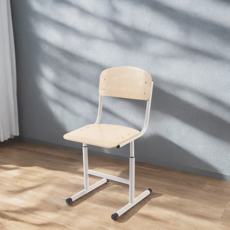 Dimensiunea spătarului: 380x200 mm. Dimensiunea șezutului: 380x350 mm. Înălțime reglabilă: 340 / 380 / 420 / 460 mm. Greutate: 4,49 kg. Spătarul și șezutul sunt realizate din placaj multistrat ergonomic, lăcuit, cu grosime de 8 mm, având colțuri rotunjite și margini curbate pentru confortul picioarelor. Designul în formă de „T” oferă stabilitate în utilizare. Elemente din lemn fixate de cadrul metalic cu șuruburi și piulițe ascunse. Structura este realizată din țeavă rotundă de 25 mm, îmbinată telescopic cu 32 mm (grosime 1,2 mm), într-un sistem etanș, cu garnituri din plastic sigure, fixate în timpul reglării. Cadrul este prevăzut cu marcaje pe ambele părți pentru grupurile de creștere. Profilele metalice sunt vopsite în câmp electrostatic, polimerizate, și echipate cu capace din plastic rezistent la ambele capete pentru protecția pardoselii. Culoare placaj: lemn. Culori cadru: verde, gri, galben, gri grafit.