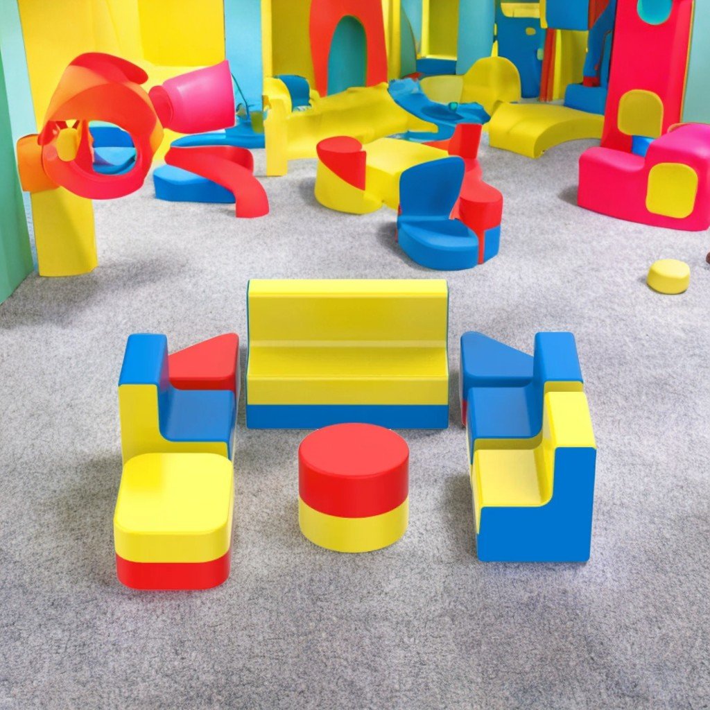 Set de mobilă pentru copii „Living” format din 3 fotolii, 1 canapea, 1 pouf-masă rotund, 2 poufuri colțar și 1 pouf dreptunghiular. Înălțimea șezutului este de 30 cm, iar a pouf-ului masă de 40 cm. Dimensiuni: fotoliu 50×50 cm cu spătar de 30 cm, canapea 100×50 cm cu spătar de 30 cm, dimensiuni totale asamblate 2,0×1,7×0,6 m. Realizat din țesătură PVC 630 g/m² sau piele ecologică europeană, umplutură din spumă poliuretanică primară 22 kg/m³, prevăzut cu fermoare și scai.