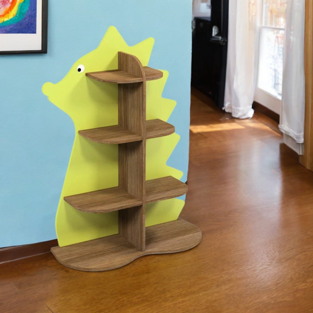 Culoarea rafturilor este stejar urban cafeniu, iar peretele din spate, care formează silueta ariciului, este vopsit într-o nuanță vibrantă de lime.