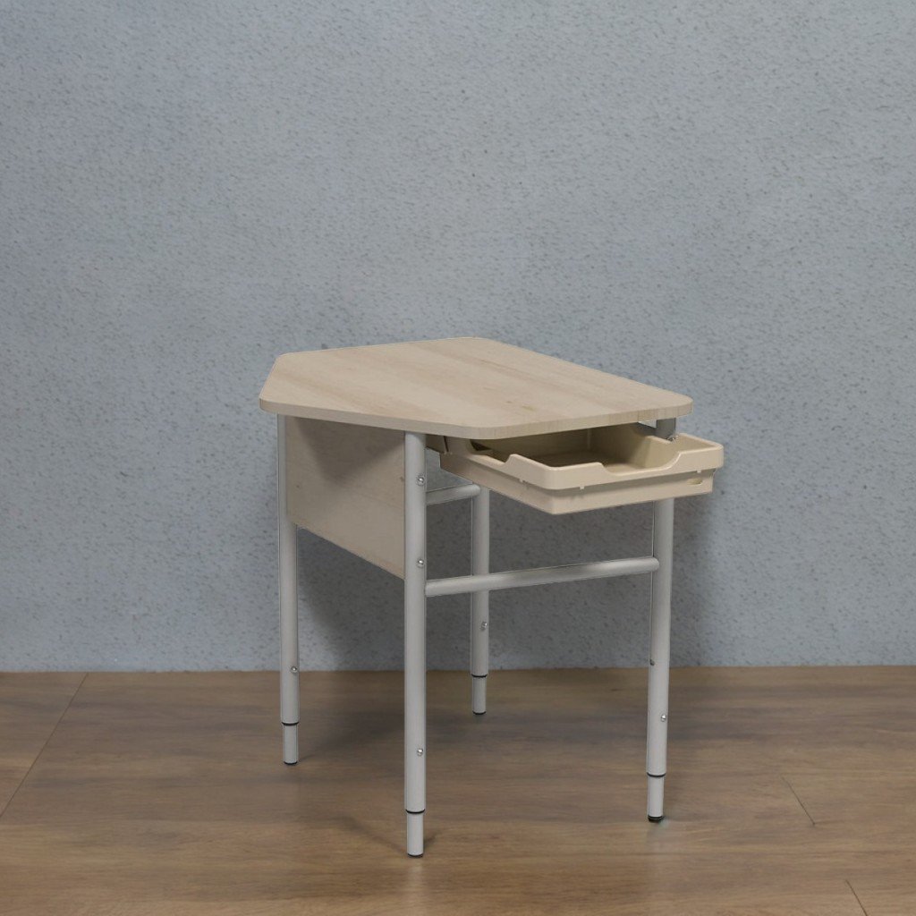 Dimensiuni (Lxl): 700x597 mm; Înălțime reglabilă: 640/700/760/820 mm; Blat PAL melaminat 18 mm, cant ABS 1,8 mm, colțuri rotunjite; Fixare blat și ecran frontal pe cadru metalic cu accesorii ascunse; Cârlig ghiozdan lateral; Cutie depozitare plastic colorată, cu ghidaje pentru montaj stânga/dreapta; Profile metalice rotunde diam. 25 și 32 mm, grosime 1,2 mm, îmbinare telescopică ermetică cu garnituri din plastic; Vopsire electrostatică și polimerizare; Garnituri protecție pardoseală; Marcaje pentru grupele de înălțime; Culori blat: stejar deschis, gri, fag; Culori cadru: gri RAL7035, verde RAL6018, galben RAL1018, gri grafit.