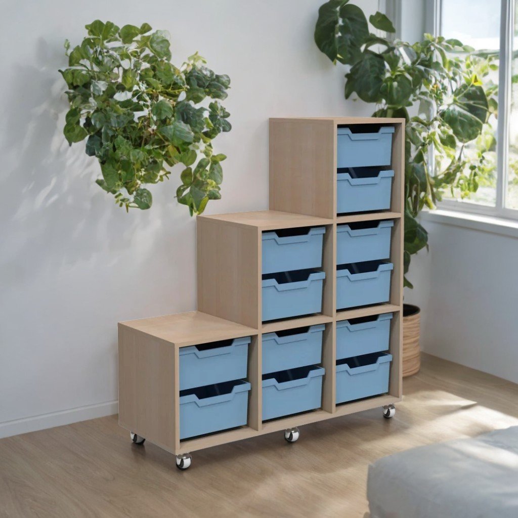 Dimensiuni (Lxlxh): 1040 x 400 x 1178 mm Etajera este fabricată din PAL melaminat de 16 mm, cu margini finisate cu bandă PVC de 1 mm. Include 12 tăvi din plastic, ideale pentru depozitarea jucăriilor, materialelor didactice, cărților și obiectelor personale ale copiilor. Asamblare sigură cu accesorii speciale. Echipată cu 6 roți pivotante pentru mobilitate ușoară. Culori disponibile: stejar lăptos, fag, lavandă, lime, portocaliu, crem, albastru marin, galben