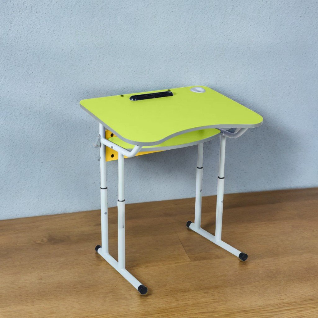 Banca școlară individuală cu poliță, blat rabatabil cu unghi reglabil, pe cadru rotund, pentru grupele 3-6; Dimensiuni (LxL): 700x500 mm; Greutate: 10,6 kg; Înălțime reglabilă: 580-760 mm conform grupelor de creștere (№3:1300-1450 mm, №4:1450-1600 mm, №5:1600-1750 mm, №6:1750-1900 mm); Unghi blat reglabil: 0°-16°; Blat PAL melaminat 16 mm cu cant ABS 1 mm; Față frontală și poliță PAL melaminat 16 mm și 0,5 mm; Compartiment pixuri, suport pahar și carte; Poliță depozitare și agățător ghiozdan; Profile metalice rotunde 25/32 mm, grosime 1,2 mm, garnituri plastic; Vopsire electrostatică și polimerizare; Culori blat: fag, stejar deschis; Culori cadru: verde, galben, gri, gri grafit.