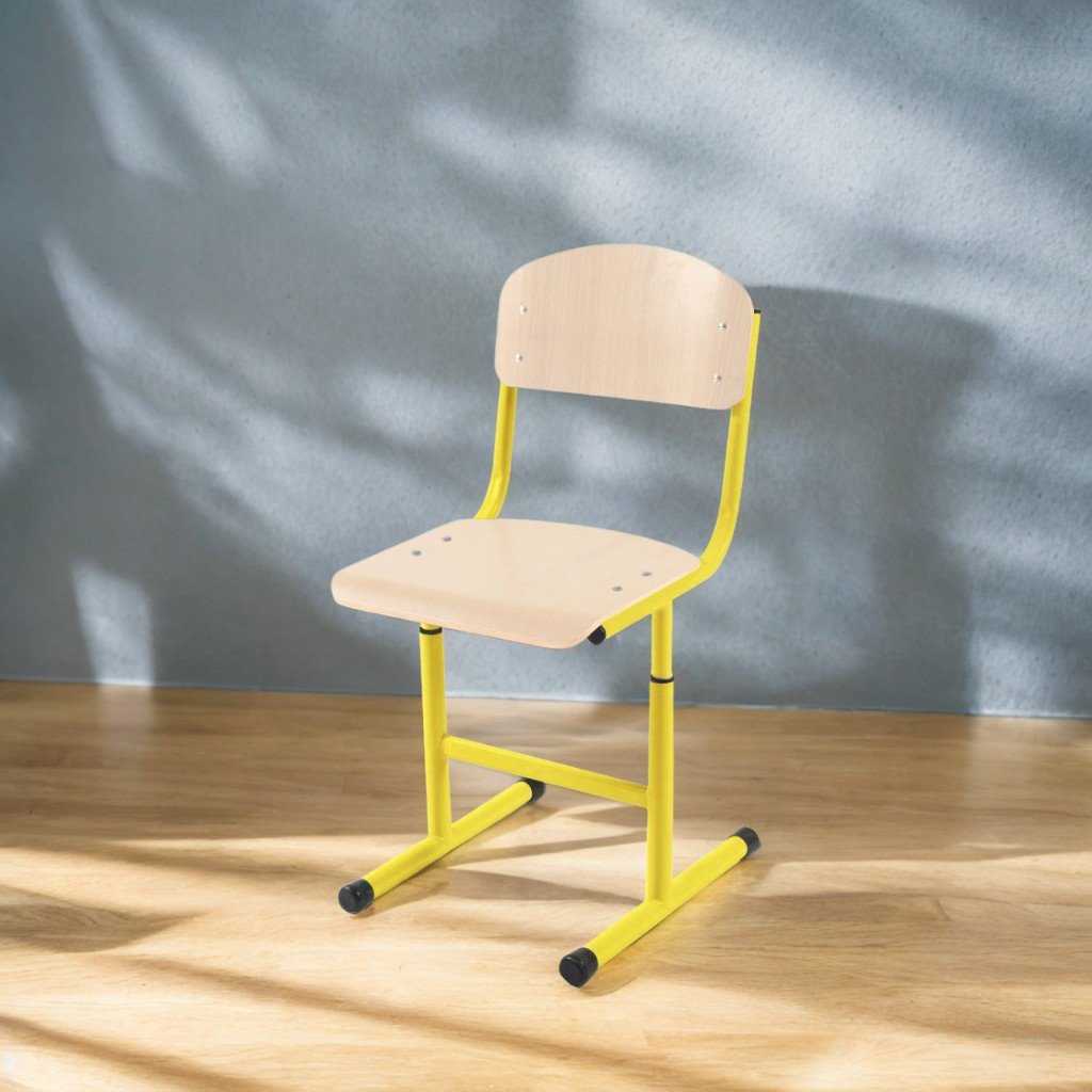 Dimensiunea spătarului: 380x200 mm. Dimensiunea șezutului: 380x350 mm. Înălțime reglabilă: 380 / 420 / 460 mm. Greutate: 4,57 kg. Spătarul și șezutul sunt realizate din placaj multistrat ergonomic de 8 mm, cu acoperire HPL de 0,4–0,5 mm, rezistent la zgârieturi, umezeală și detergenți agresivi. Colțurile rotunjite și marginile curbate oferă confort suplimentar picioarelor. Designul în formă de „T” asigură stabilitate și fiabilitate. Părțile din lemn sunt fixate de profiluri metalice prin accesorii de asamblare sigure. Structura este realizată din țevi rotunde: 25 mm îmbinate telescopic cu 32 mm (grosime 1,2 mm), cu zone etanșe protejate de garnituri din plastic. Cadrul este vopsit electrostatic, polimerizat și dotat cu capace din plastic rezistent pentru protecția pardoselii. Culori disponibile pentru placaj: fag, stejar deschis, albastru deschis, jasmin, gri. Culori cadru: verde, gri, galben, gri grafit.