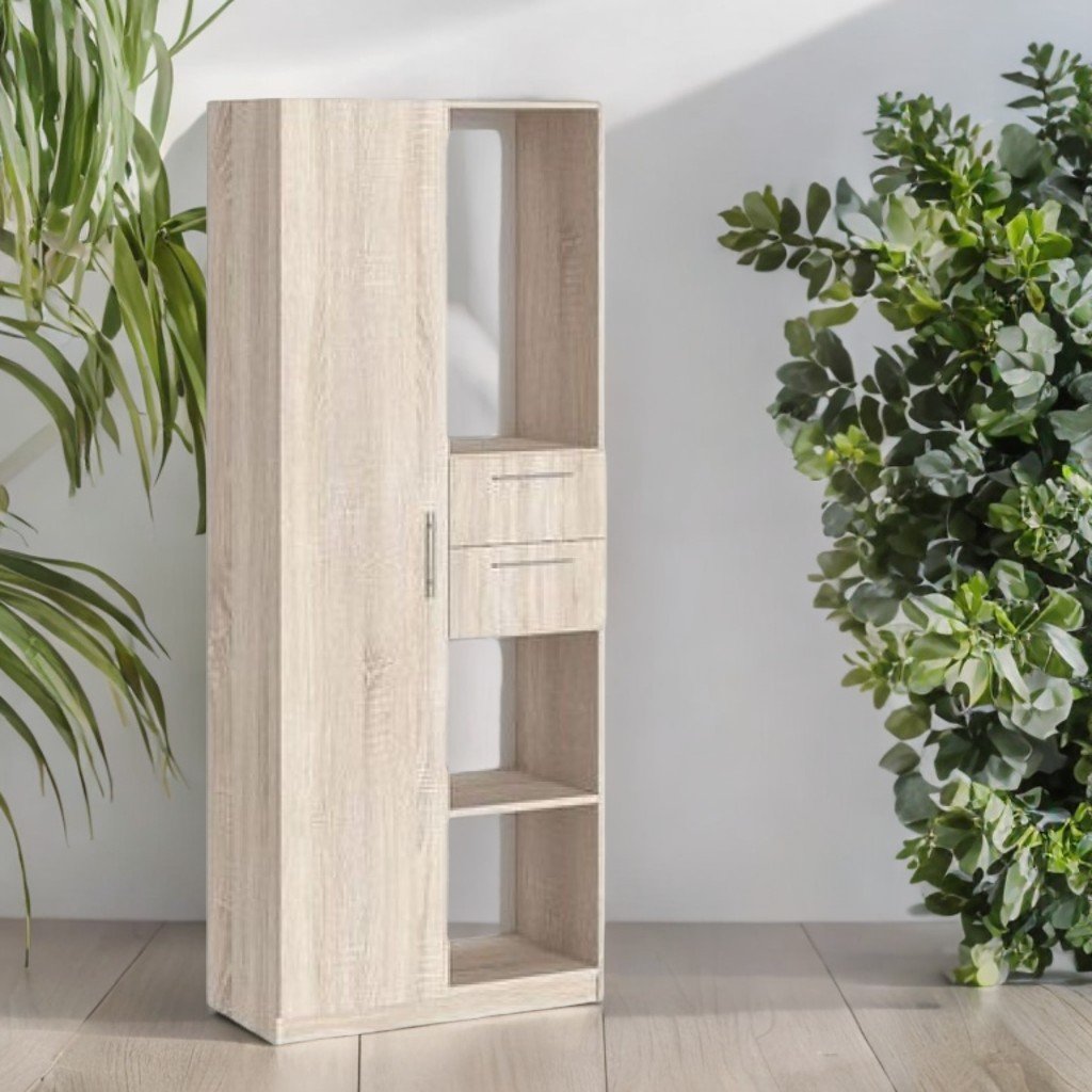 Dimensiuni (L×l×h): 800×400×2000 mm. Dulap realizat din PAL melaminat cu grosimea de 18 mm. Fațada este finisată cu cant ABS de 1 mm, iar piesele interioare cu cant de 0,5 mm. Spatele este realizat din PFL melaminat alb, grosime 3 mm. Dulapul conține 4 rafturi de tip închis cu uși și o nișă deschisă în partea inferioară. Este dotat cu mânere cromate, iar piesele sunt asamblate cu elemente de fixare speciale și sigure. Culori disponibile: frasin alb, stejar sonoma.
