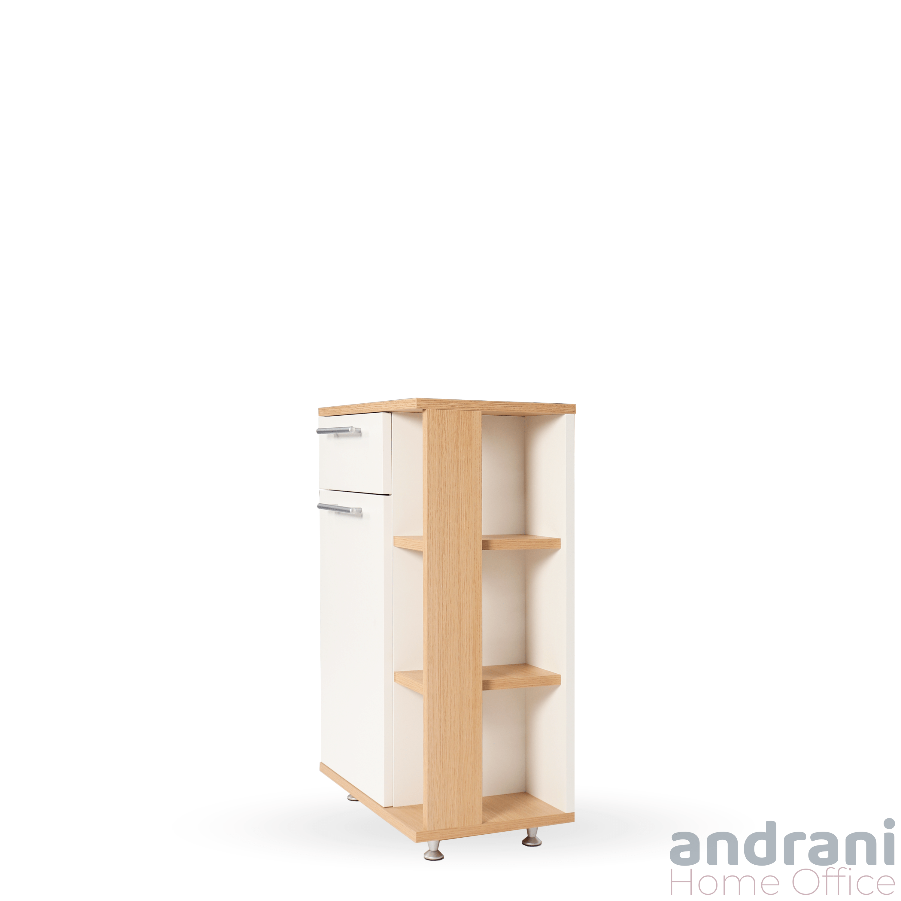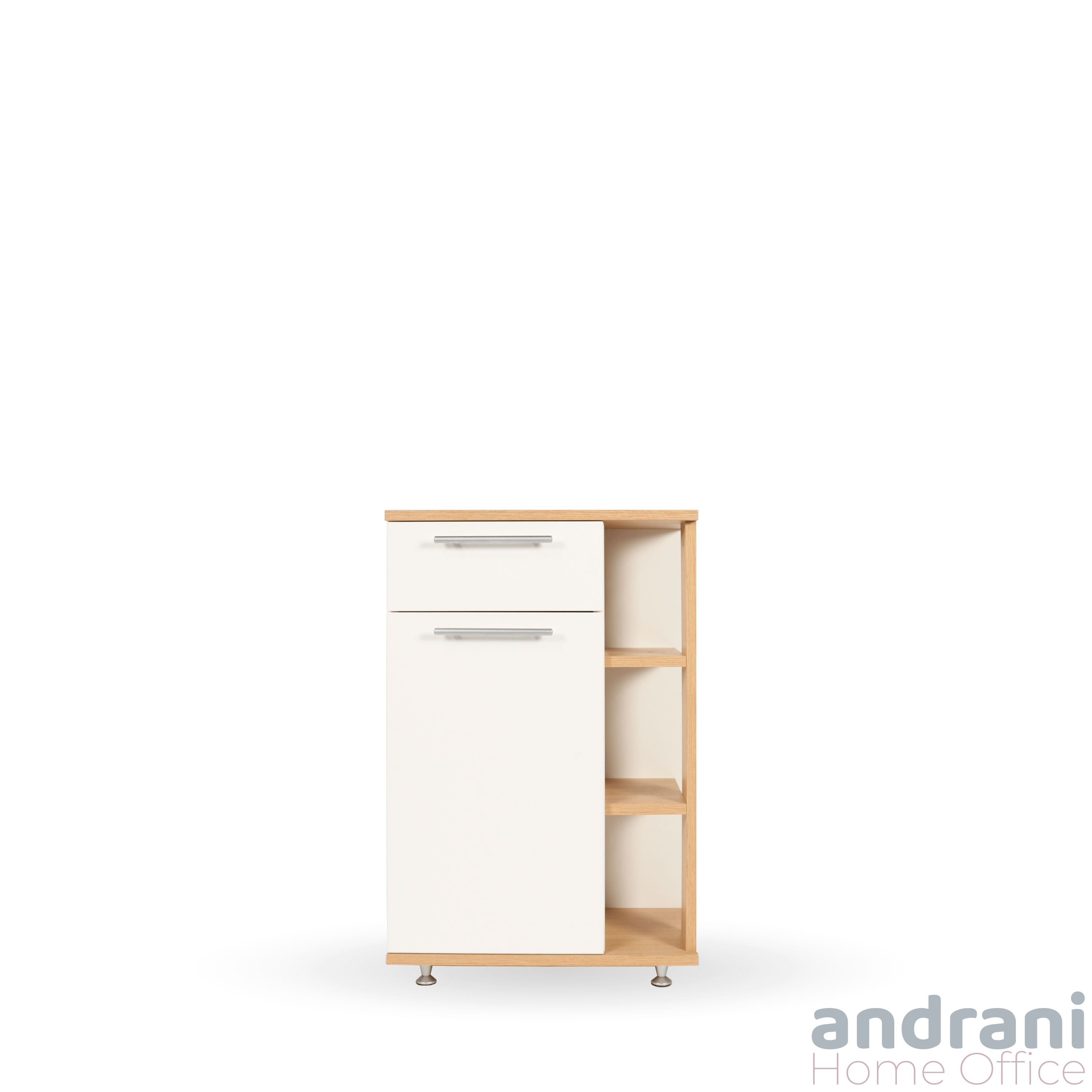 Construcția inteligentă combină un sertar superior, un spațiu închis cu ușă și polițe laterale deschise, oferind multiple opțiuni de organizare pentru obiecte personale, documente sau accesorii. Această configurație îl face ideal pentru utilizare în hol, birou, living sau spații comerciale.